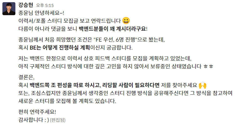 언젠가 이력서 업데이트 해야지.. 스터디 모집 해야지.. 생각만 하다가 마침 타이밍 좋게 글이 올라와 내심 반가웠습니다.