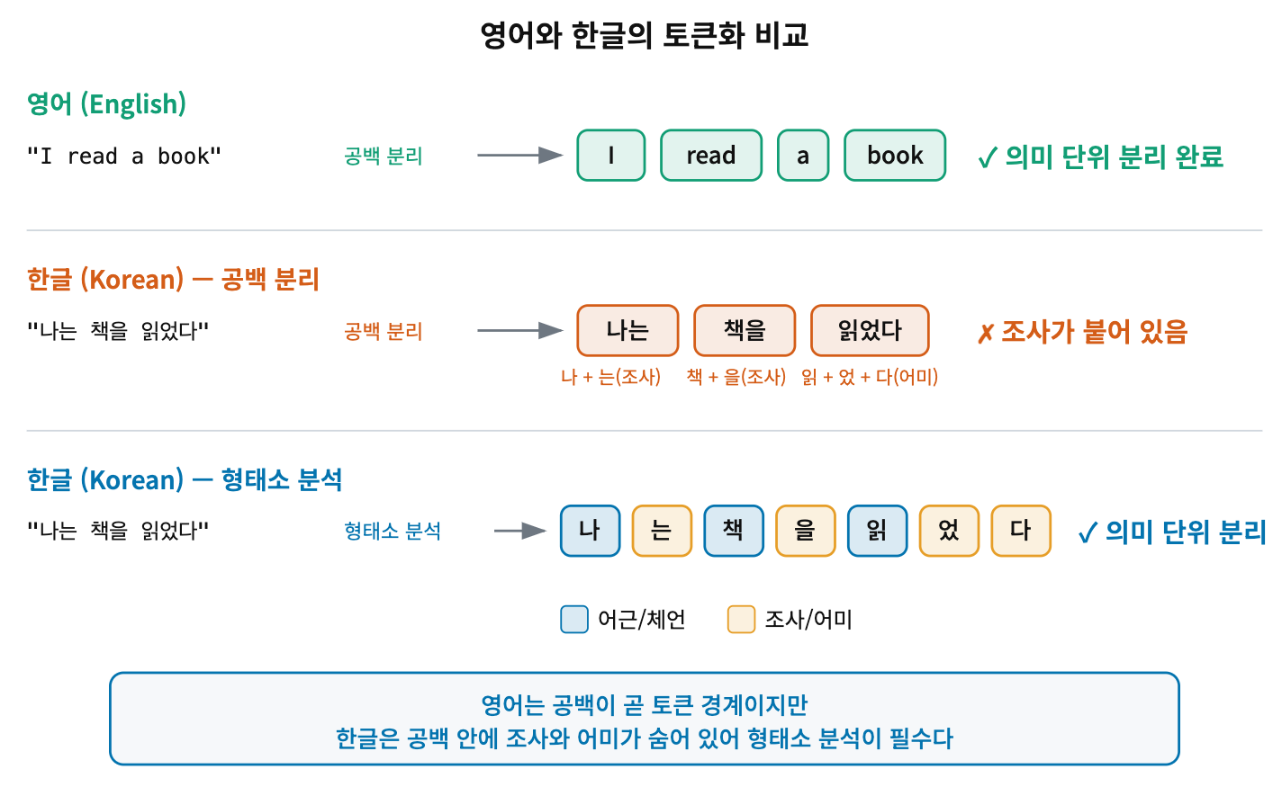 그림 2: 영어와 한글의 토큰화 차이. 영어는 공백 분리만으로 의미 단위가 나뉘지만, 한글은 공백으로 나눠도 조사와 어미가 어근에 붙어 있다. 형태소 분석을 거쳐야 "나/는", "책/을", "읽/었/다"처럼 의미 단위로 분리된다.