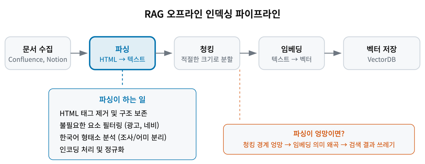 그림 1 : RAG 오프라인 인덱싱 파이프라인에서 파싱의 위치. 파싱은 문서 수집 직후, 청킹 직전에 위치한다. 비정형 문서(HTML, PDF 등)를 깨끗한 텍스트로 변환하는 역할이며, 이 단계의 품질이 후속 단계 전체에 영향을 준다.