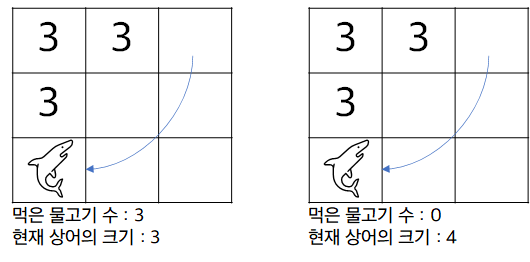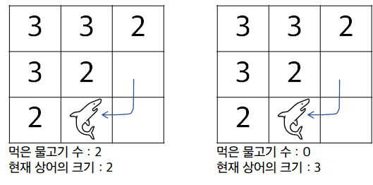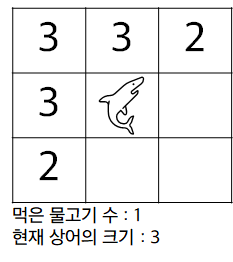 다시 먹은 물고기 수와 현재 상어의 크기가 같아지면서 상어의 크기는 1 증가하게 됩니다.