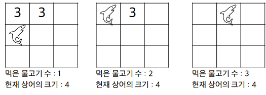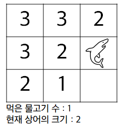 먹은 물고기 수가 현재 상어의 크기와 같아지면서 상어는 크기가 1 커지게 됩니다.