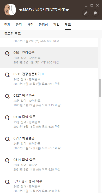 SSAFY엔 입실,퇴실 설문을 해야하는 시스템이 있습니다.